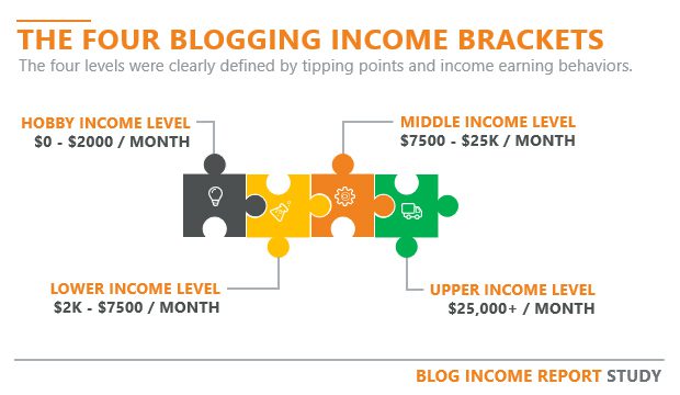 Secondo il blog income report study, gli affiliati che lo fanno per hobby guadagnano tra i gli 0$ e i 2000$ al mese, e poi abbiamo gli affiliati che ci si dedicano giornalmente, divisi in 3 livelli: il livello basso (2000-7500$ / mese) il livello medio (7500- 25.000$ / mese) e il livello top (+ di 25.000$ al mese).