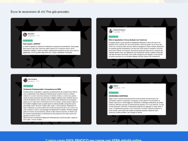 Guarda ad esempio la landing del mio corso gratuito Start Kit, ho messo subito in evidenza le testimonianze di chi l’ha provato:
