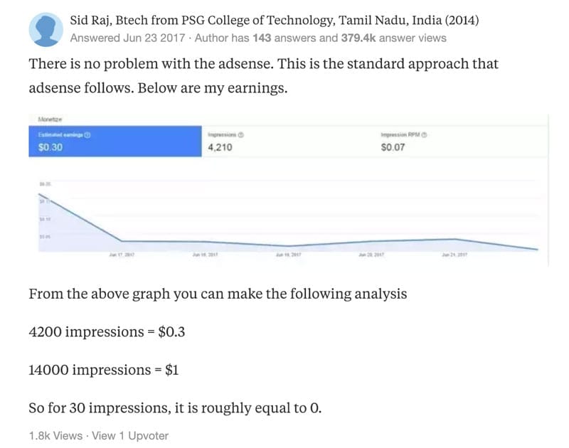 Guarda, su Quora ho trovato un simpatico siparietto. Un utente inesperto, chiede come mai con “ben” 30 visite i suoi guadagni siano ancora pari a zero.