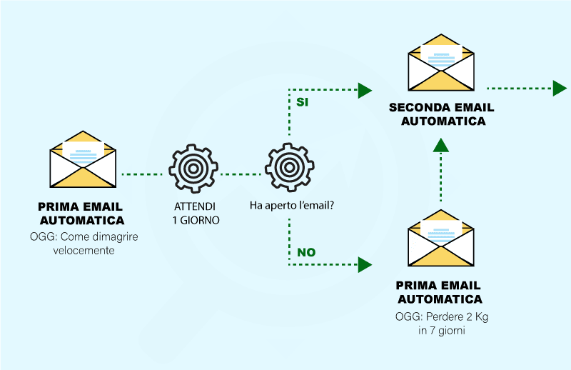 - Se l’email viene aperta, si passa alla seconda email della serie.