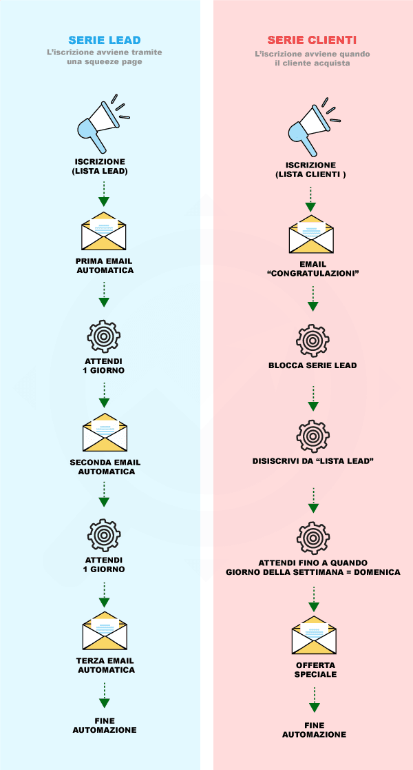 - Se il lead diventa cliente, non deve ricevere più nessuna delle email della serie dedicata ai lead (ha acquistato, non devi più convincerlo ad acquistare)