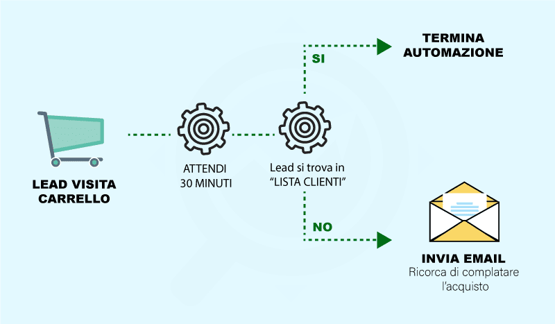 SE [lead visita pagina carrello senza acquistare] → Invia email “Ricorda di completare l’acquisto”