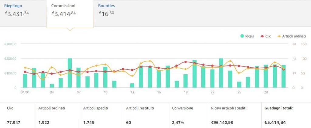 E infine, ma non meno importante, avrai un’area utente dedicata con tutte le statistiche di cui potresti avere bisogno per migliorare e tue performance (prodotti più cliccati, percentuali delle tue vendite rispetto ai click, ecc.