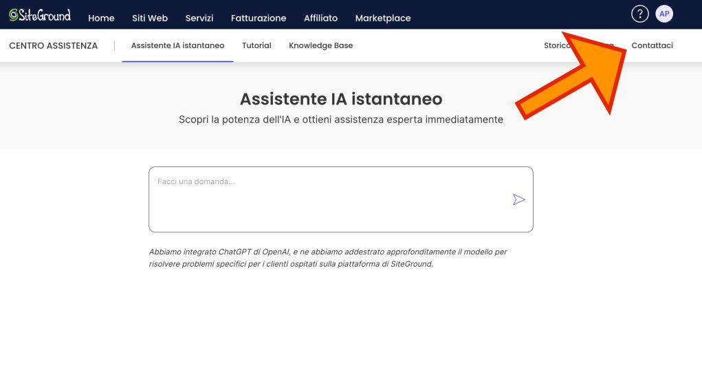 Per essere un po’ più specifici, se volessi sapere come contattare l’assistenza di SiteGround non devi far altro che premere il pulsante col punto interrogativo in alto, per poi premere sulla voce Vai al centro assistenza. Qui potrai fare delle semplici domande a una AI che ti mostrerà delle risposte preconfezionate al tuo problema, oppure premere sulla voce Contattaci.